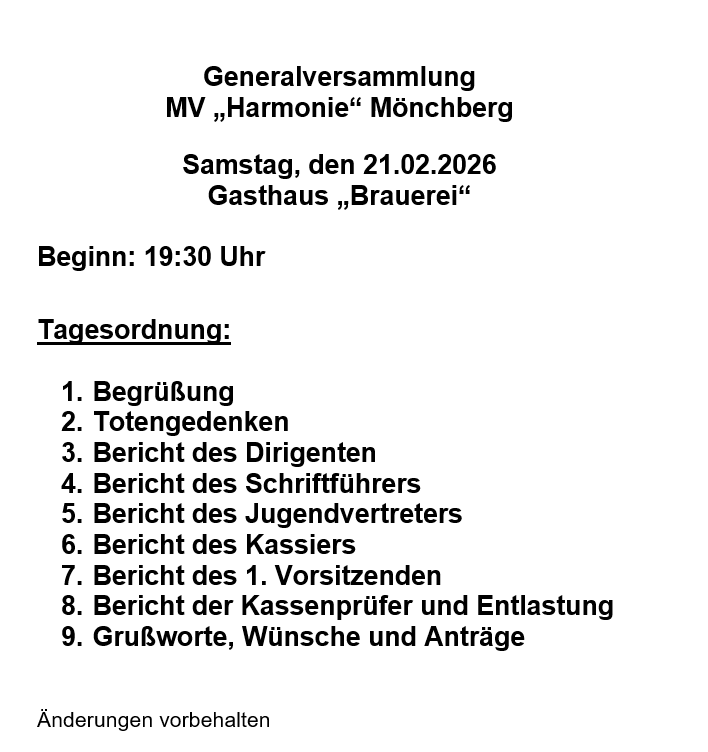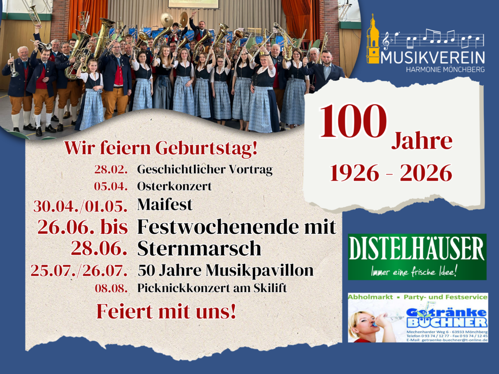 Herzlich willkommen auf der Website des Musikverein „Harmonie“ Mönchberg. Ihr könnt euch hier über aktuelle Termine, Veranstaltungen und Infos rund um unseren Musikverein informieren!